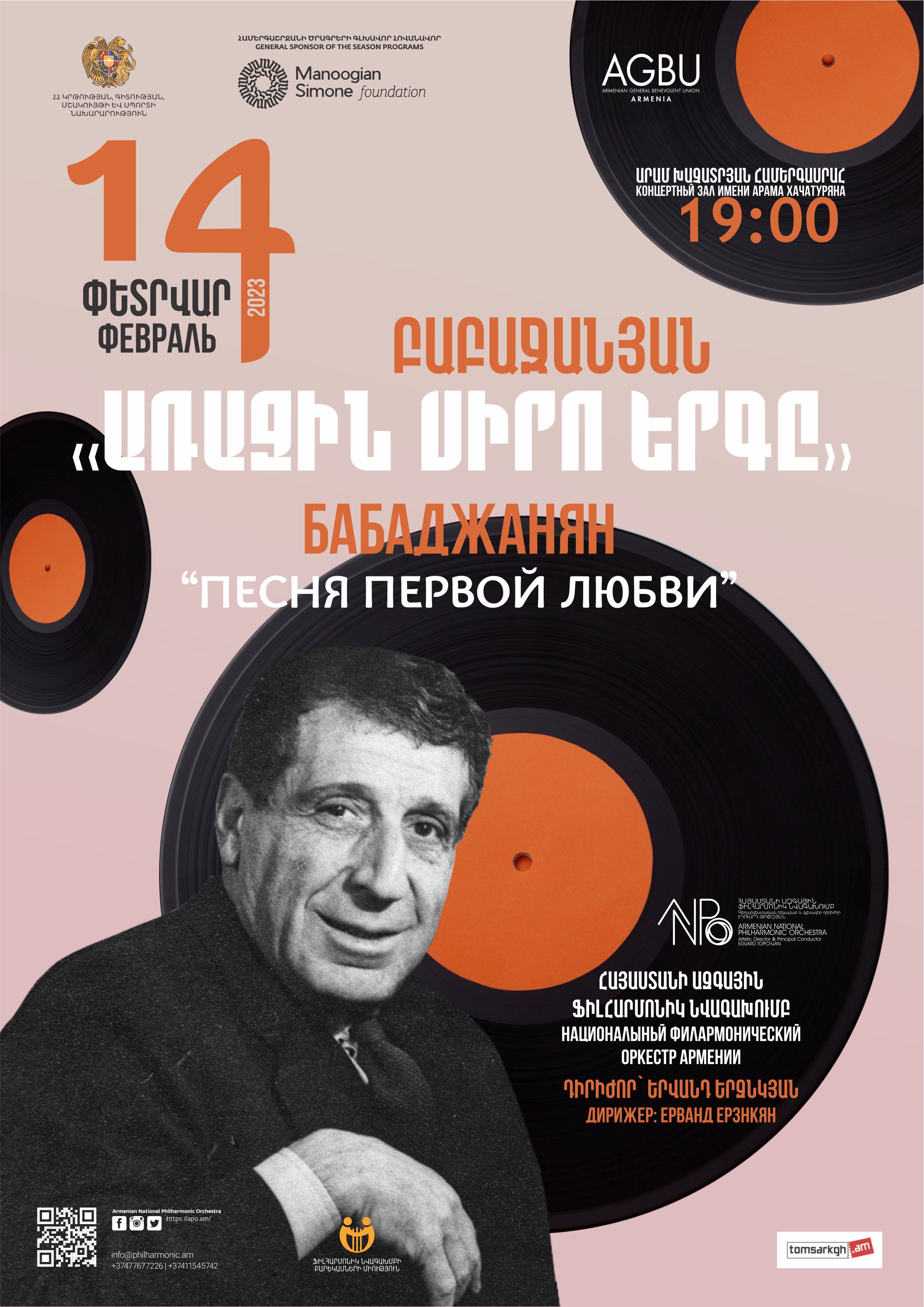 14 February 2023 Babajanian: “First love song” "Aram Khachaturian" Concert Hall Book Tickets More Details