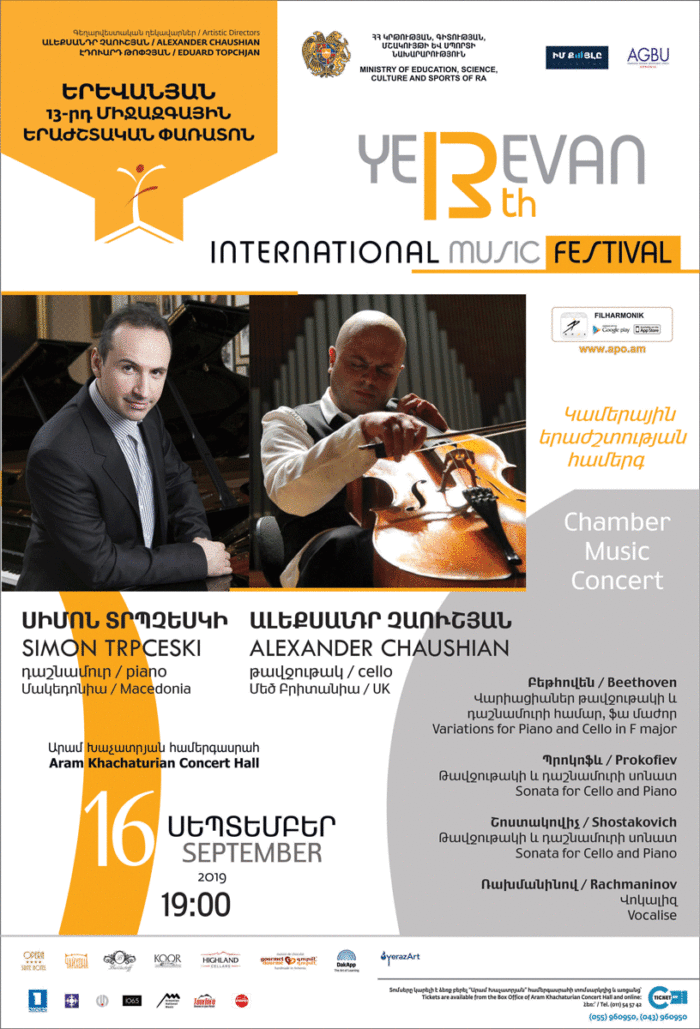 Chamber Music Evening Program Beethoven: Variations for Cello and Piano in F major /9-11 min./ Prokofiev: Cello Sonata /22-24 min./ Intermission Shostakovich: Cello Sonata /24-26 min./ Rachmaninov: Vocalise /6-7 min./ Soloists Simon Trpceski, piano (Macedonia) Аlexander Chaushian, cello (UK)