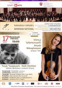 Tchaikovsky: Intermezzo (Armenian premiere) Prokofiev: Violin Concerto No.2 in g-moll /28-30 min./ Intermission Schubert: Symphony No.4 (“Tragic”) /30-33min./ Soloist: Anush Nikoghosyan, violin Conductor: Haik Davtian (France)