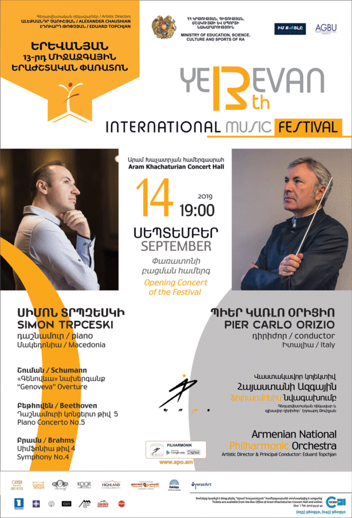 13-րդ Երևանյան միջազգային երաժշտական փառատոնի բացման համերգ Ծրագիր Շուման՝ «Գենովևա» նախերգանք /7-8 ր./ Բեթհովեն՝ Դաշնամուրի կոնցերտ թիվ 5 /40-42 ր./ Ընդմիջում Բրամս՝ Սիմֆոնիա թիվ 4 /44-46 ր./ Սիմոն Տրպչեսկի, դաշնամուր (Մակեդոնիա) Դիրիժոր՝ Պիեր Կառլո Օրիցիո (Իտալիա)